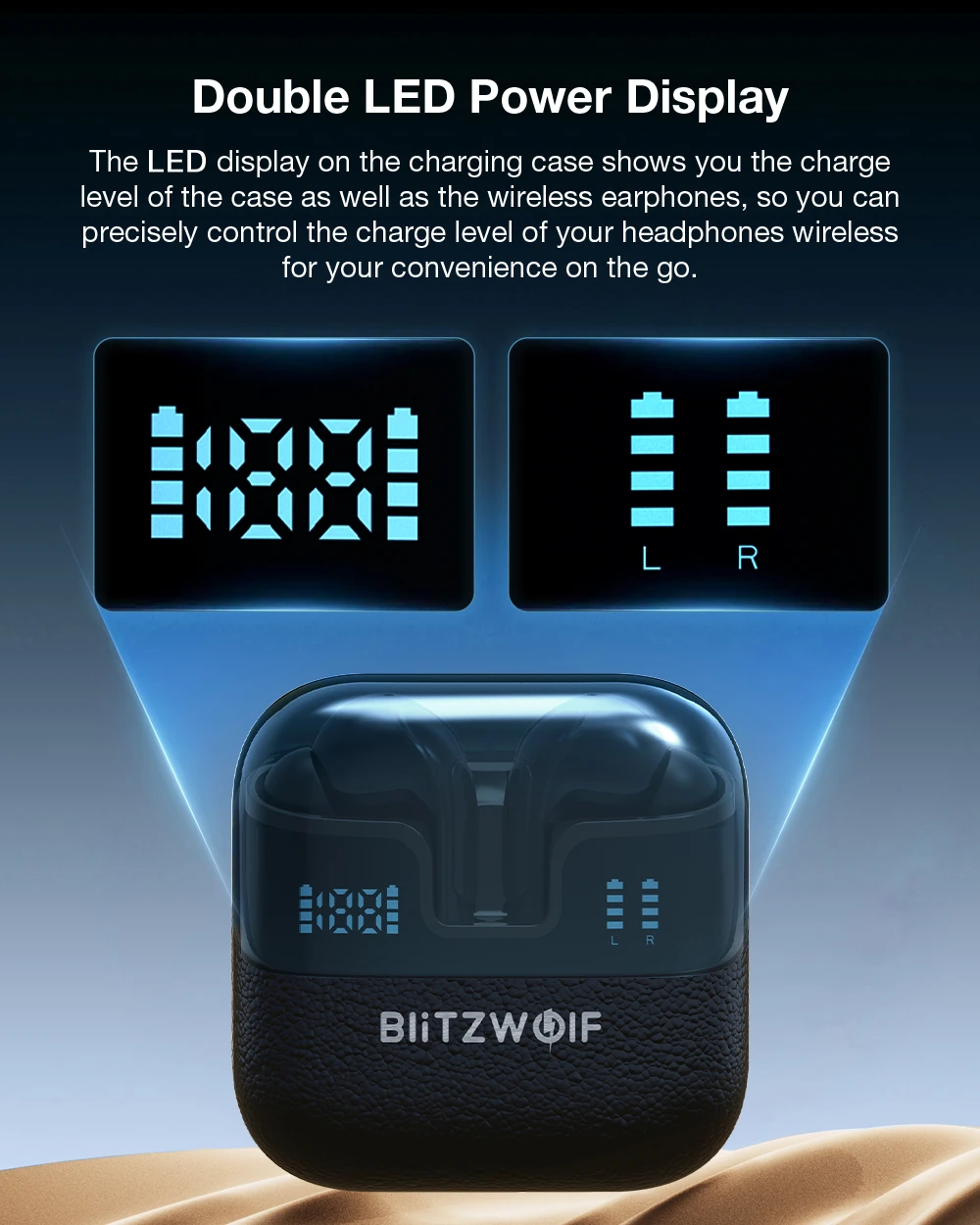 Una delle caratteristiche speciali dei BlitzWolf BW-FYE17 è la scatola di ricarica, sulla quale un doppio display LED mostra il livello di carica attuale sia della scatola di ricarica che degli auricolari. Questa funzione consente di tenere sempre traccia della carica disponibile, senza sorprese in movimento.