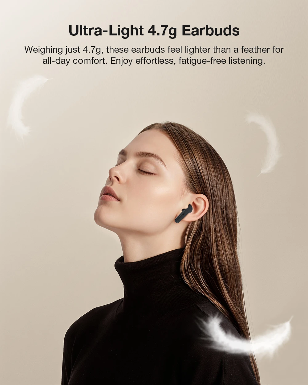Grazie al design ergonomico, gli auricolari si adattano perfettamente alla forma dell'orecchio, risultando stabili e comodi anche durante un uso prolungato. E il peso ultraleggero di soli 4,7 grammi li rende quasi impercettibili da indossare.