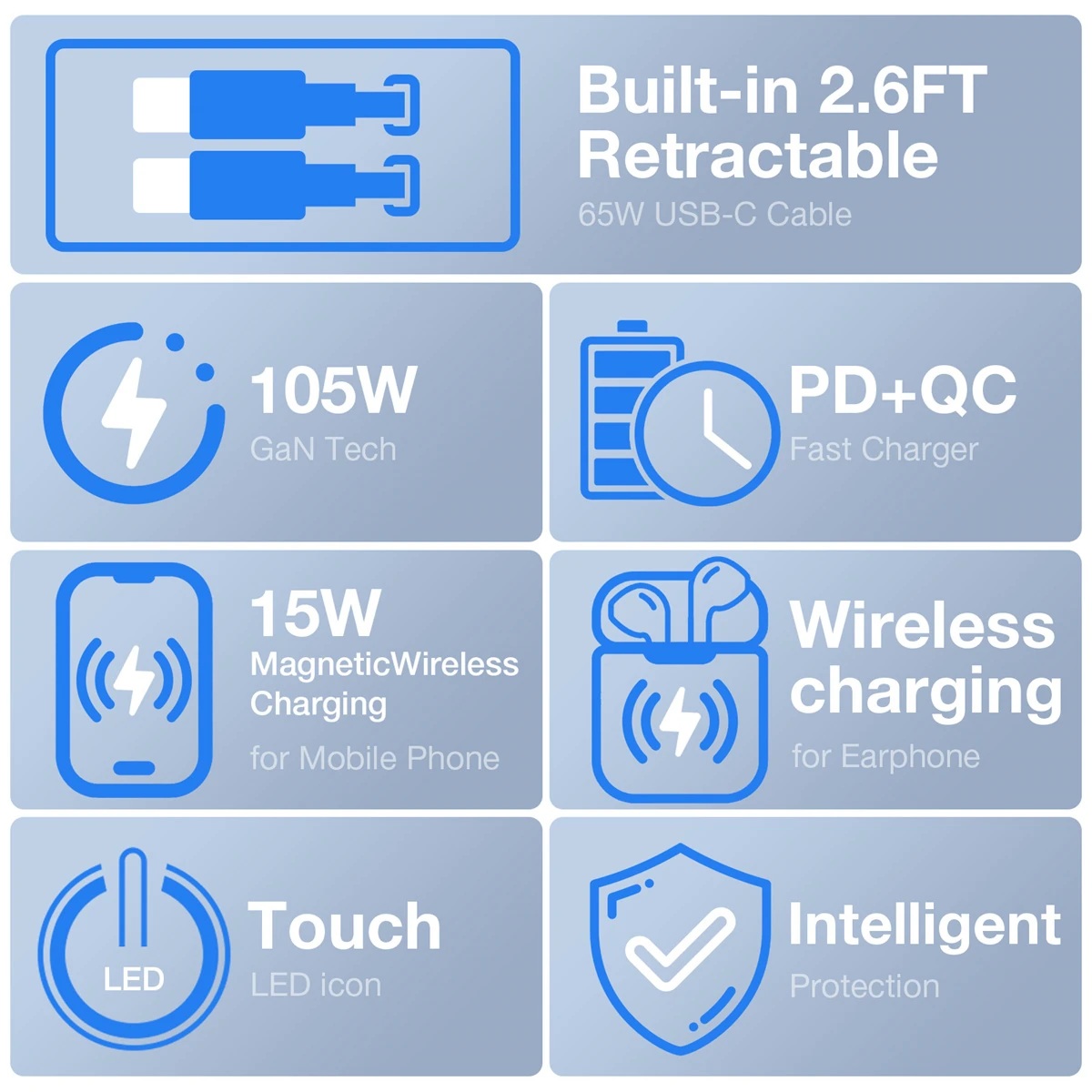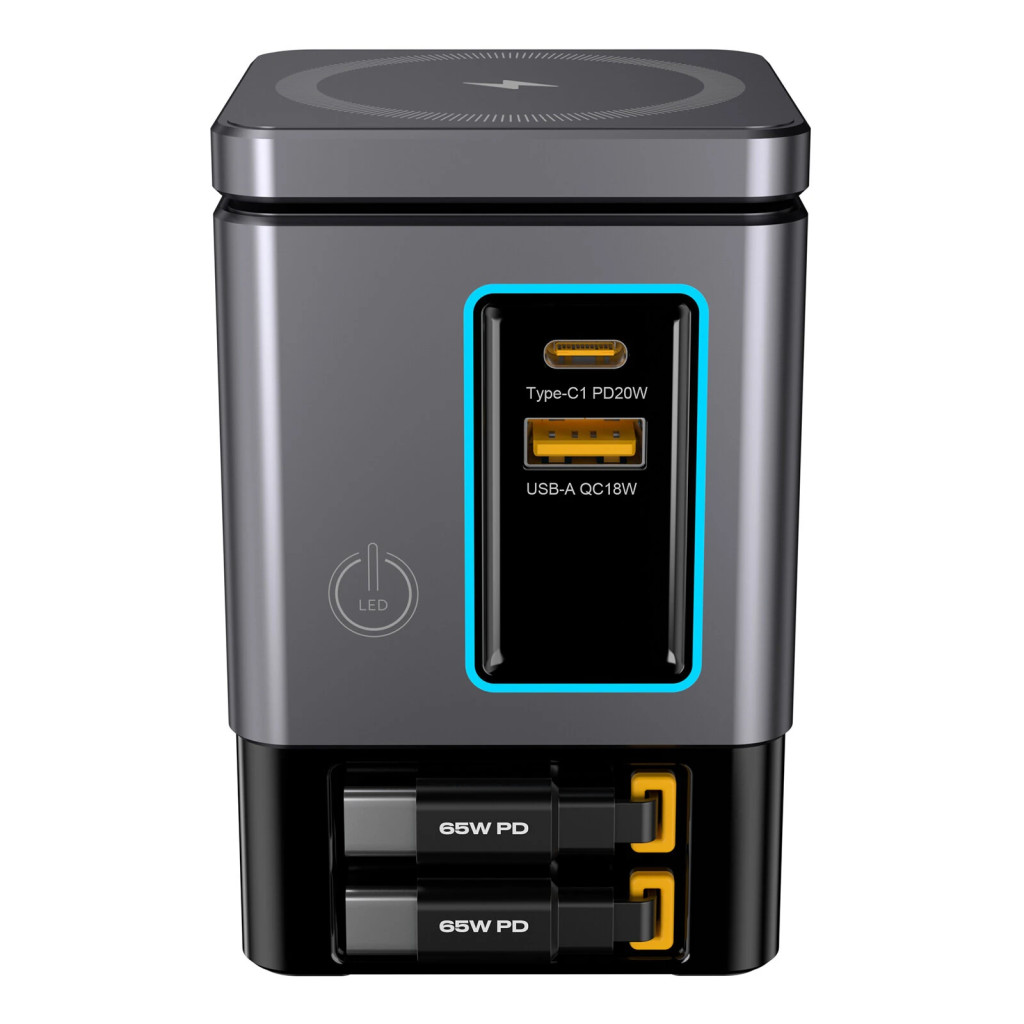 - Porte: 2 cavi Type-C telescopici integrati, 1 porta USB-A, 1 porta USB-C, superficie di ricarica wireless 2-in-1.