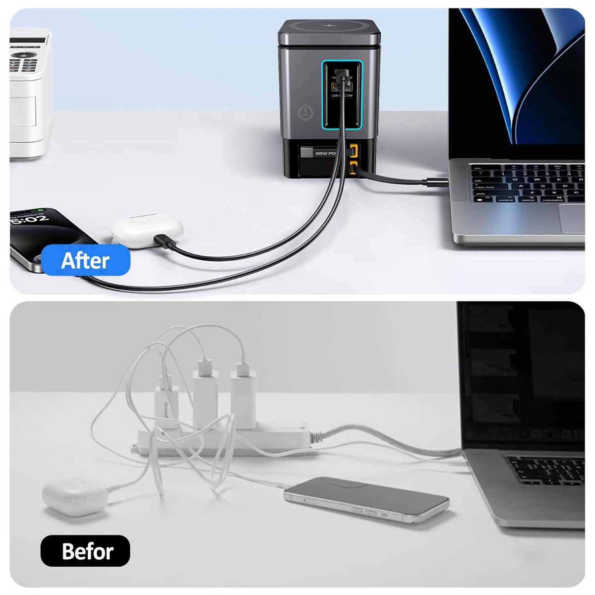 - In ufficio o nell'angolo home office: Finalmente puoi dire addio a cinque diversi alimentatori. Questo unico dispositivo serve contemporaneamente il tuo laptop, lo smartphone e le cuffie.
