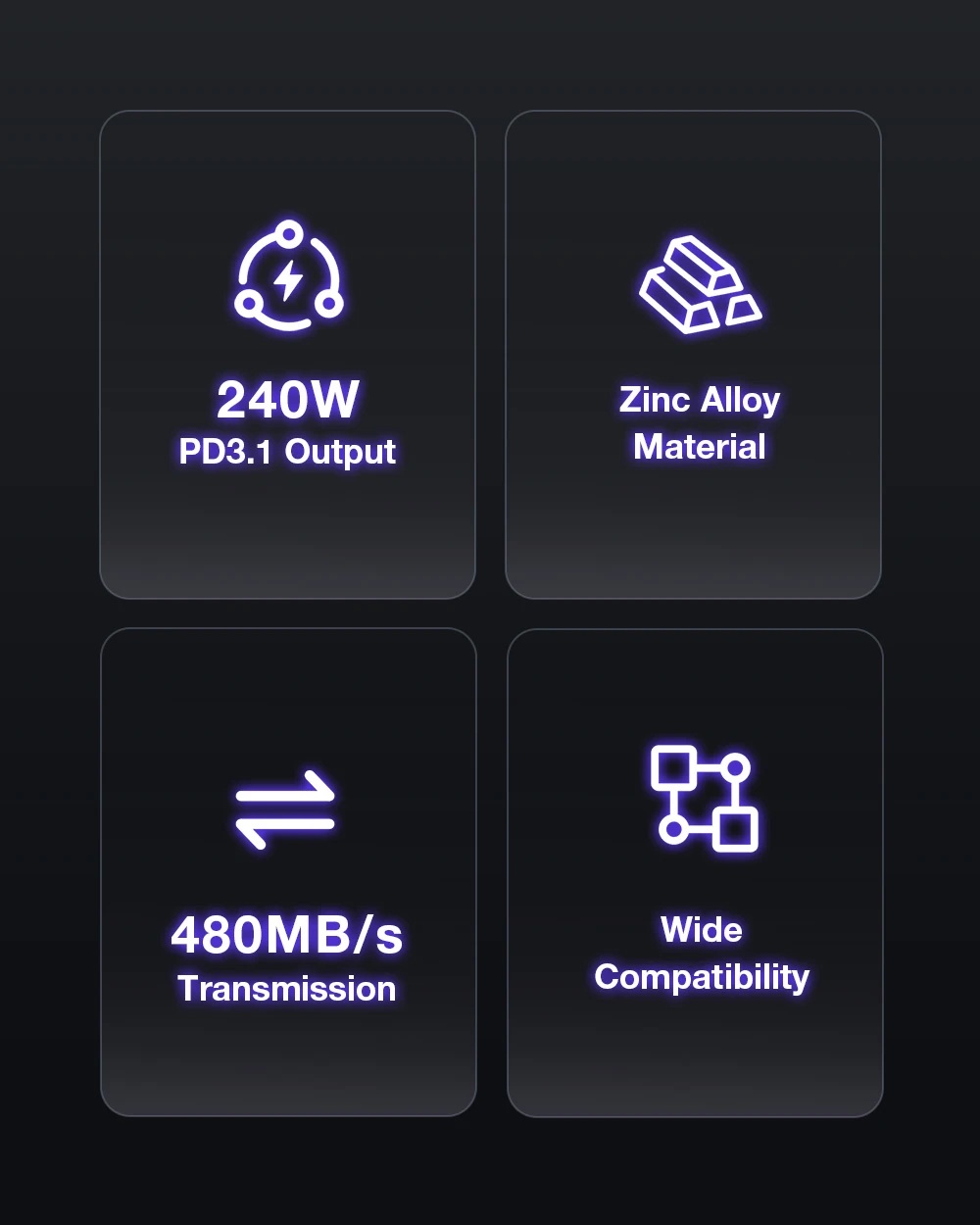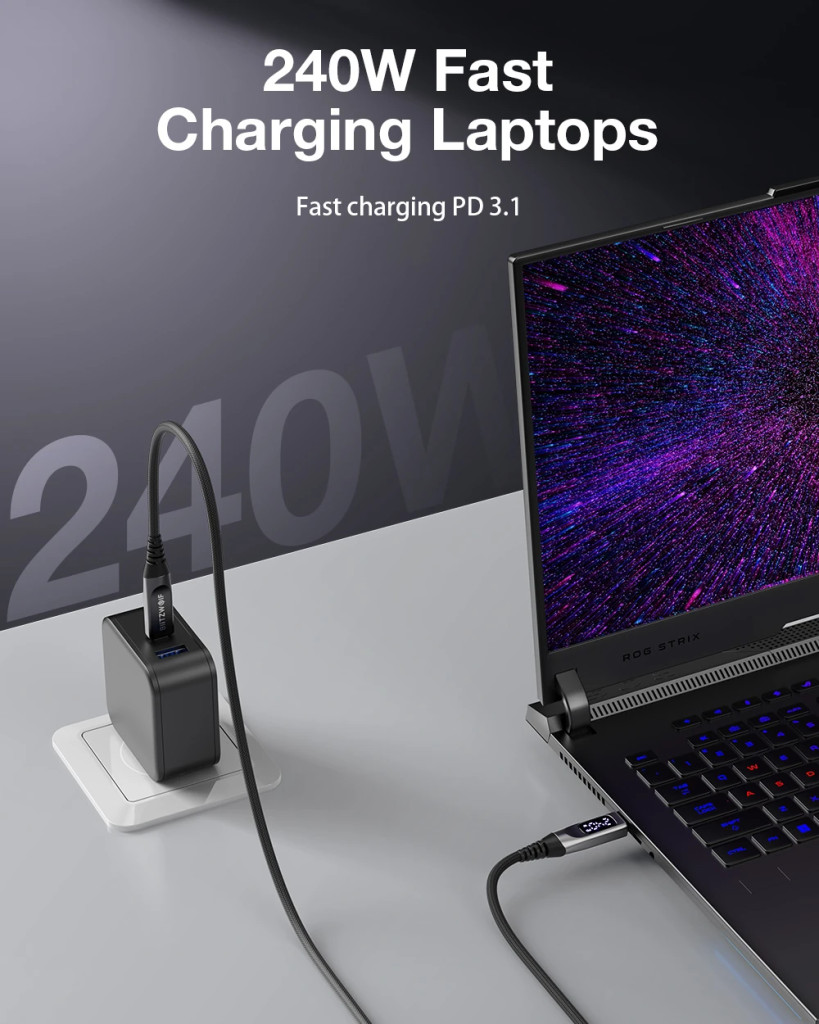 Ricarica rapida estrema 240W PD3.1: Grazie al supporto del nuovo protocollo PD3.1, il cavo è in grado di trasmettere fino a 240W di potenza. Ciò significa che puoi ricaricare alla massima velocità non solo gli smartphone, ma anche i laptop da gaming e i tablet più esigenti.