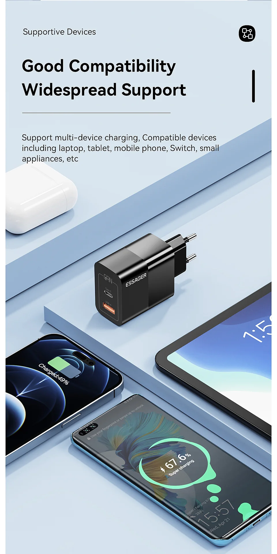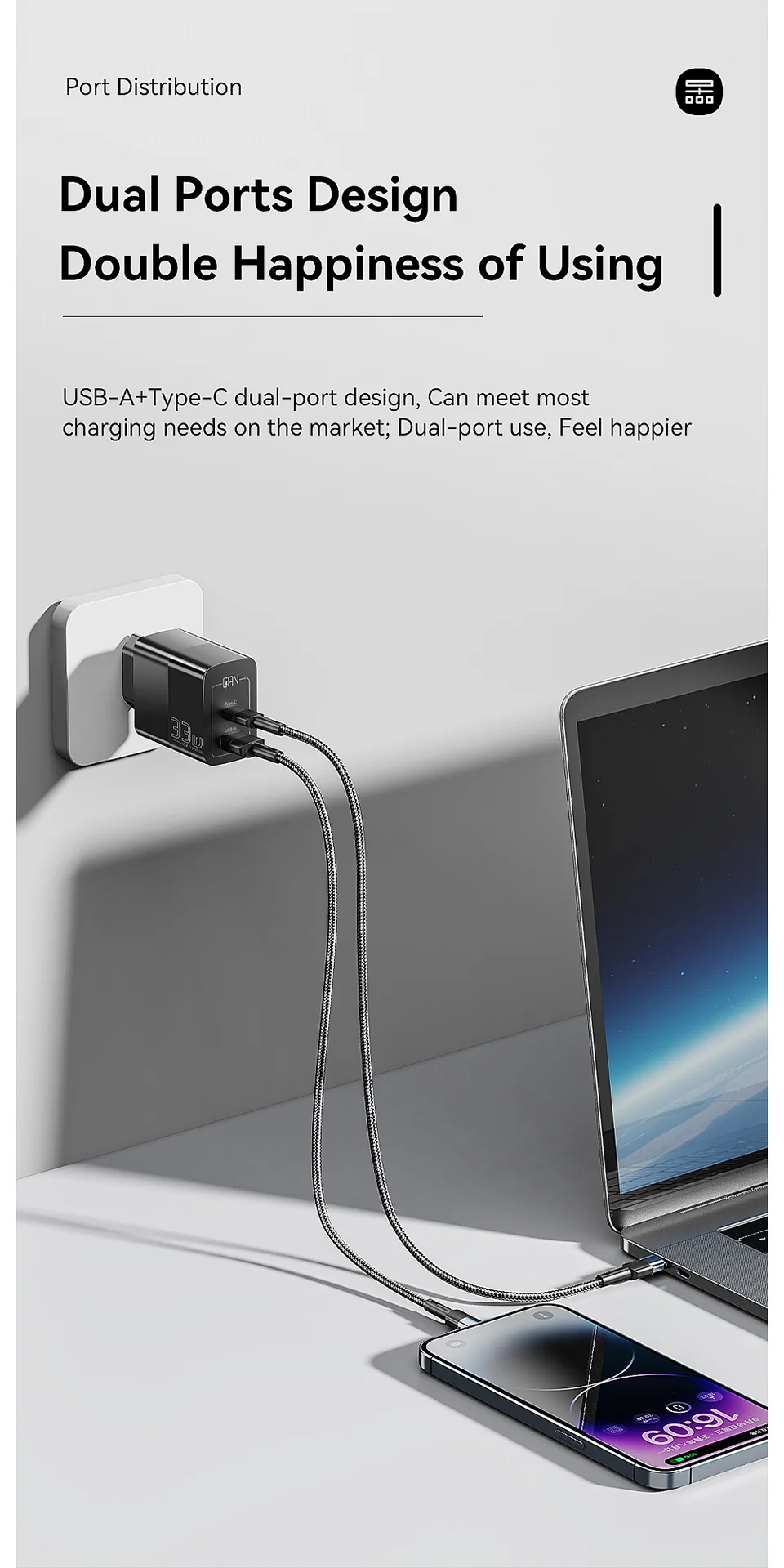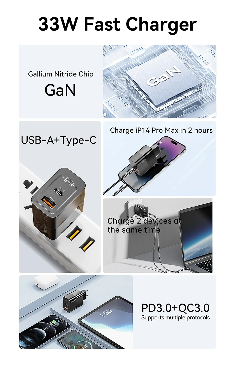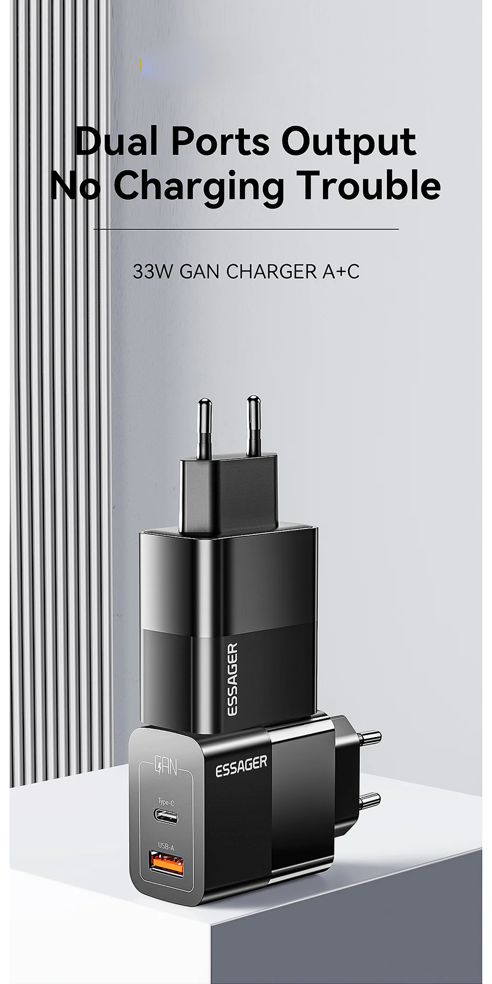 Sei stanco di vedere la zona intorno alla tua presa a muro come un cimitero di cavi e adattatori? Il caricabatterie Dual Port ESSAGER 33W GaN è nato per mettere ordine nel caos e dimostrare che le dimensioni non sono tutto – almeno quando si parla di ricarica.