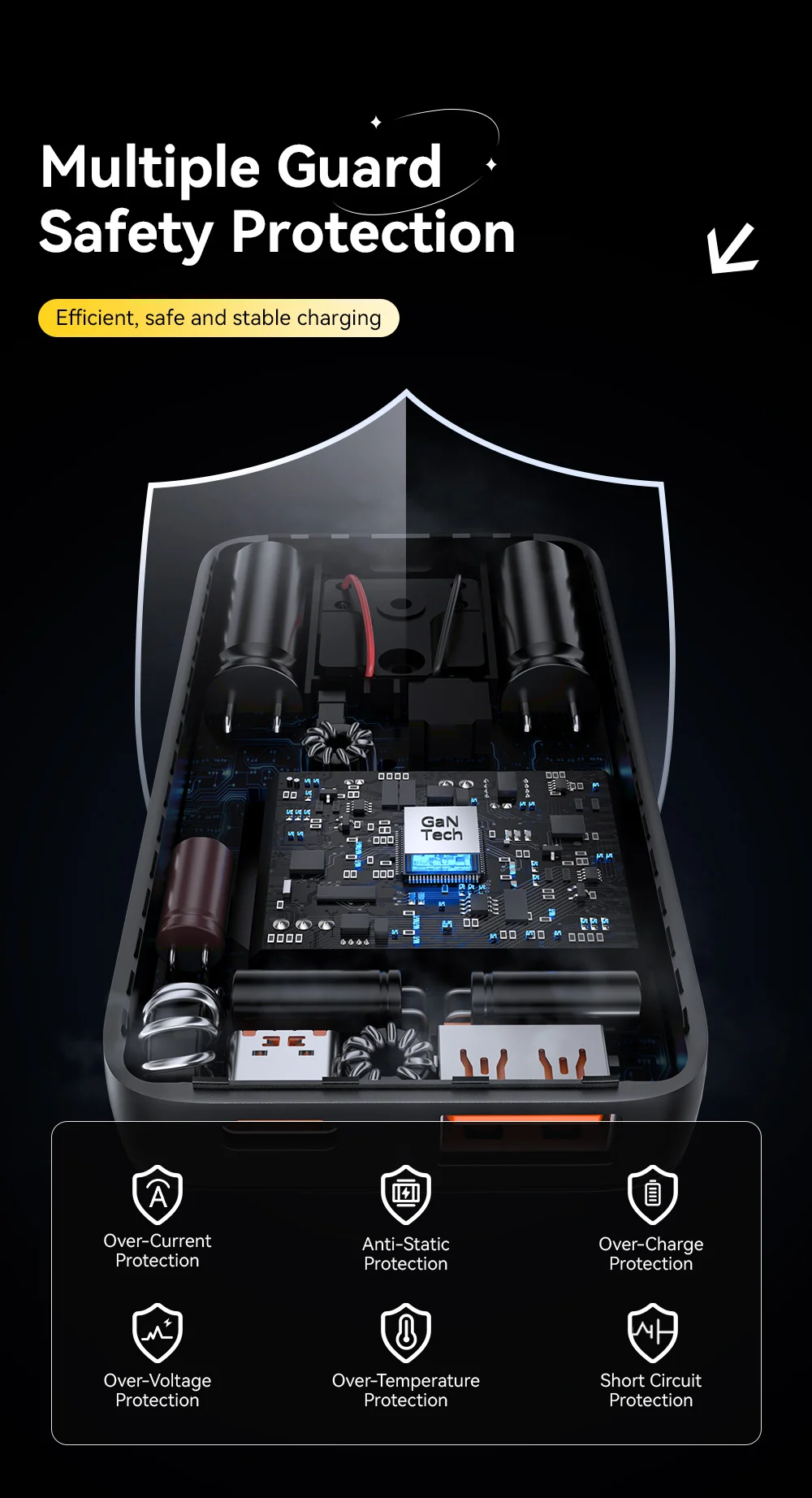 Tecnologia GaN – Più piccolo, più potente: grazie al chip al nitruro di gallio (GaN) di ultima generazione, il caricabatterie è più efficiente rispetto ai tradizionali modelli al silicio. Genera meno calore pur erogando una potenza di picco di 65 W in un alloggiamento incredibilmente compatto.