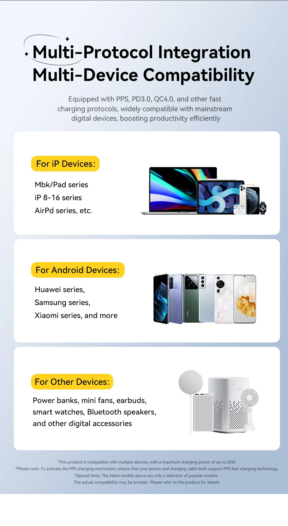 Compatibilità universale: che si tratti di un iPhone, un Samsung (con supporto PPS!), un MacBook o persino una Nintendo Switch, ESSAGER è pronto. Supporta i protocolli di ricarica rapida più diffusi (PD 3.0, PPS, QC 3.0), quindi non hai bisogno di un caricabatterie diverso per ogni marca.