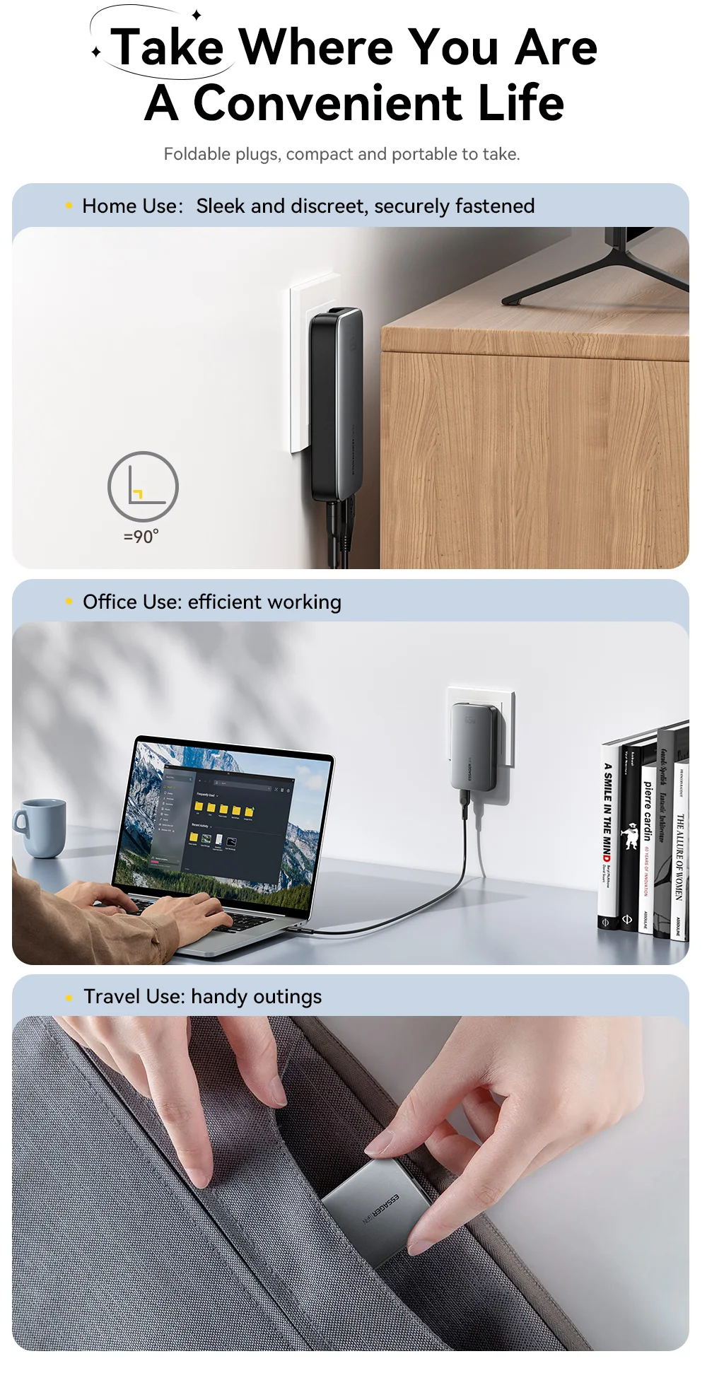 L'alimentatore ESSAGER 65W Ultra Slim non è solo un accessorio, ma il più importante alleato del viaggiatore moderno e del nomade digitale. Questo caricabatterie è poco più spesso di uno smartphone medio (solo 14,3 mm!), eppure fornisce energia sufficiente per mantenere in funzione anche i dispositivi più esigenti.