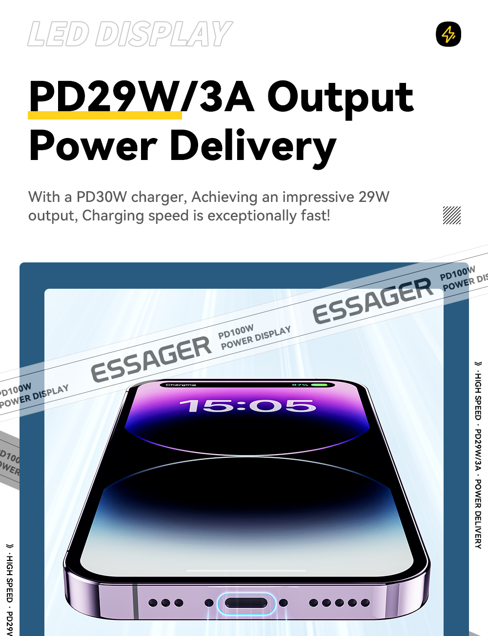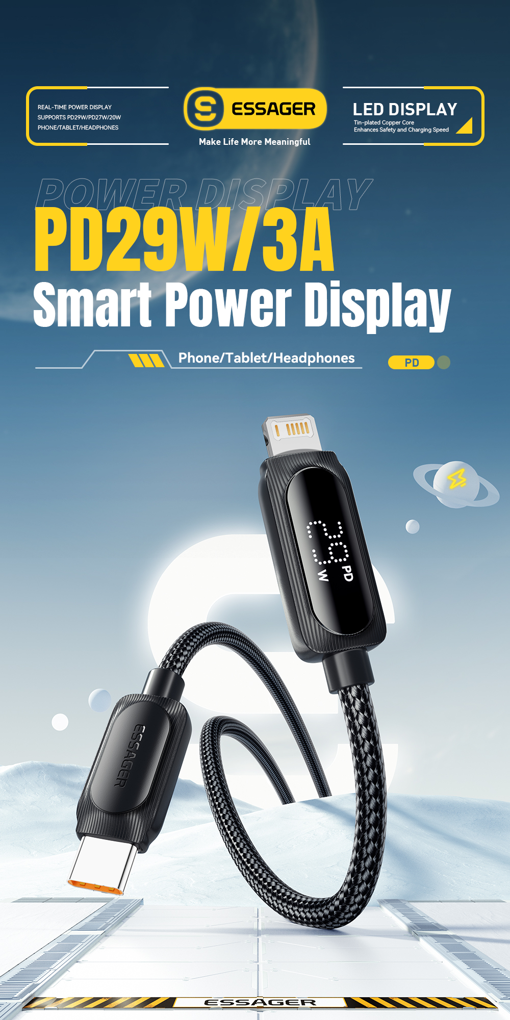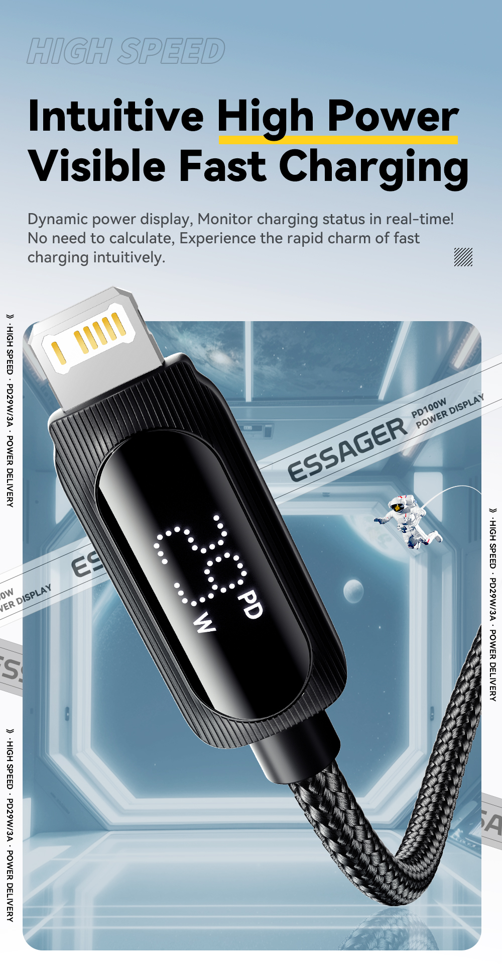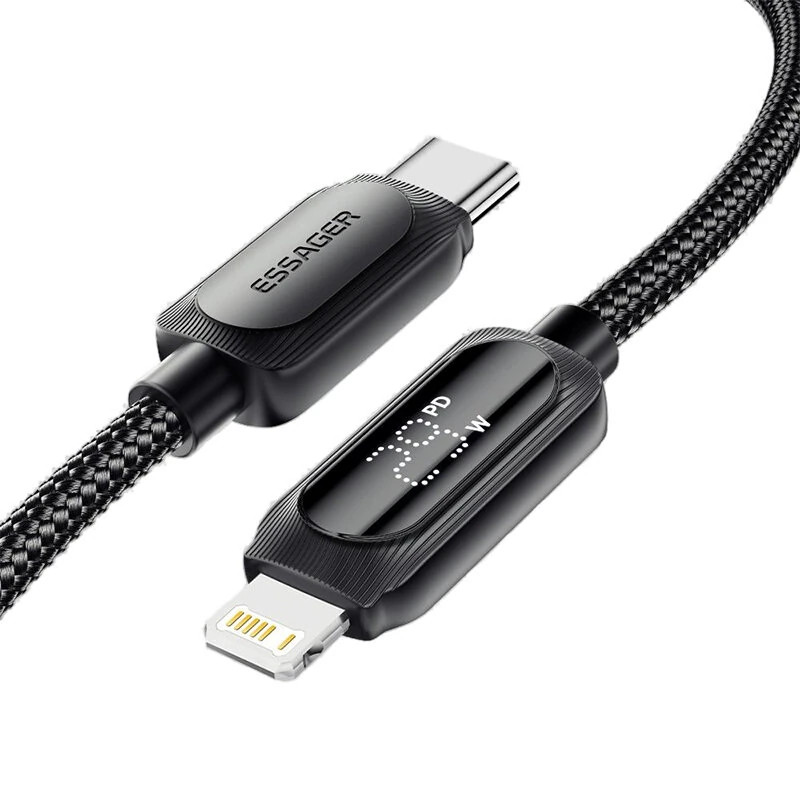 ESSAGER ES-X57 - 1 metro, Type-C - Lightning, cavo USB. Display digitale, ricarica da 29 W, rivestimento in tessuto perlato.