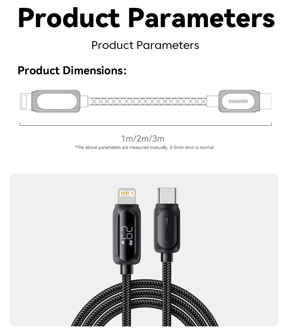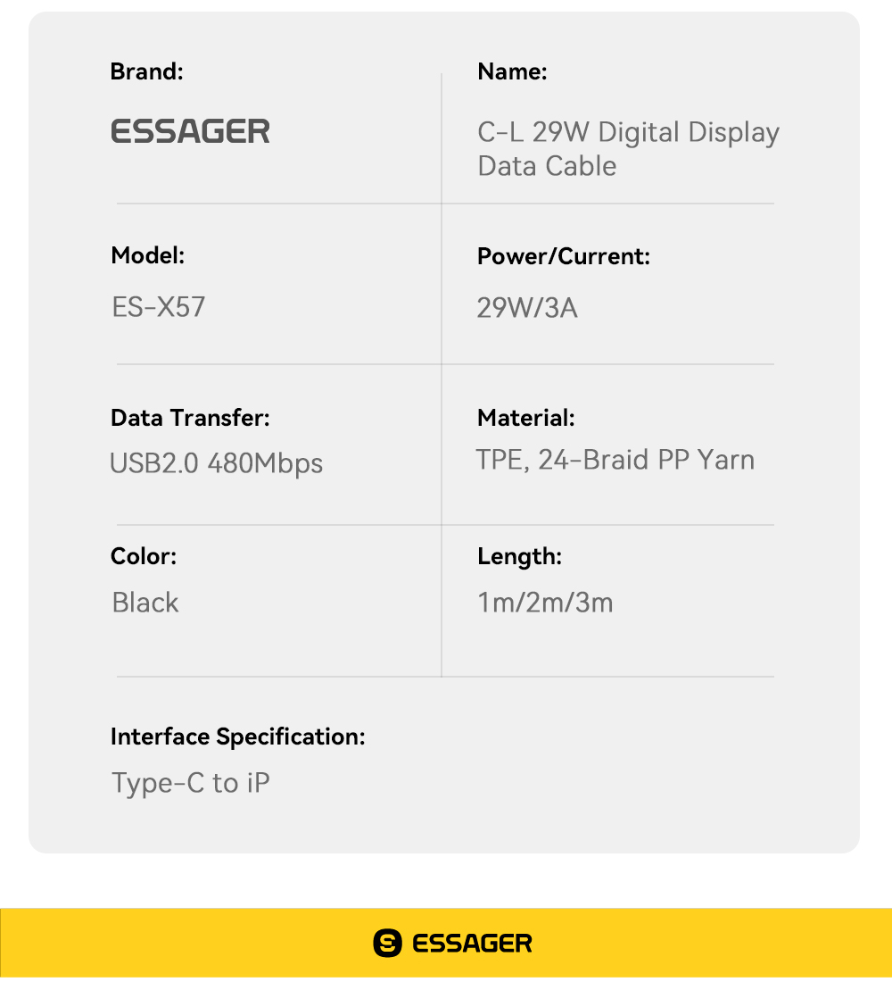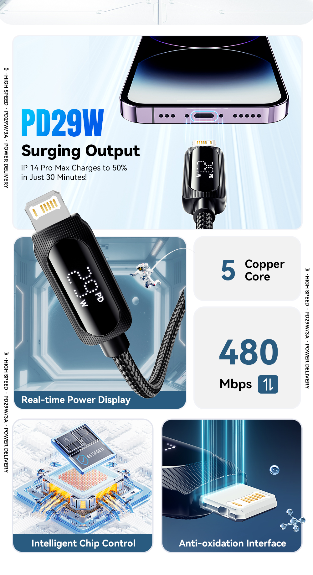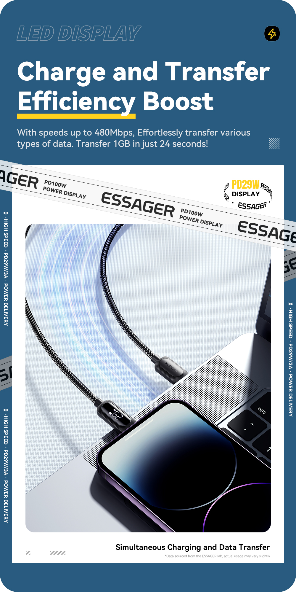 ESSAGER ES-X57 - 1 metro, Type-C - Lightning, cavo USB. Display digitale, ricarica da 29 W, rivestimento in tessuto perlato.