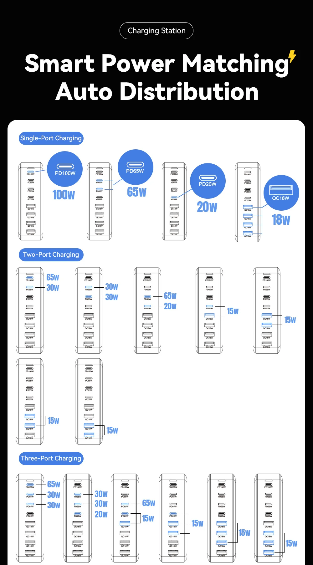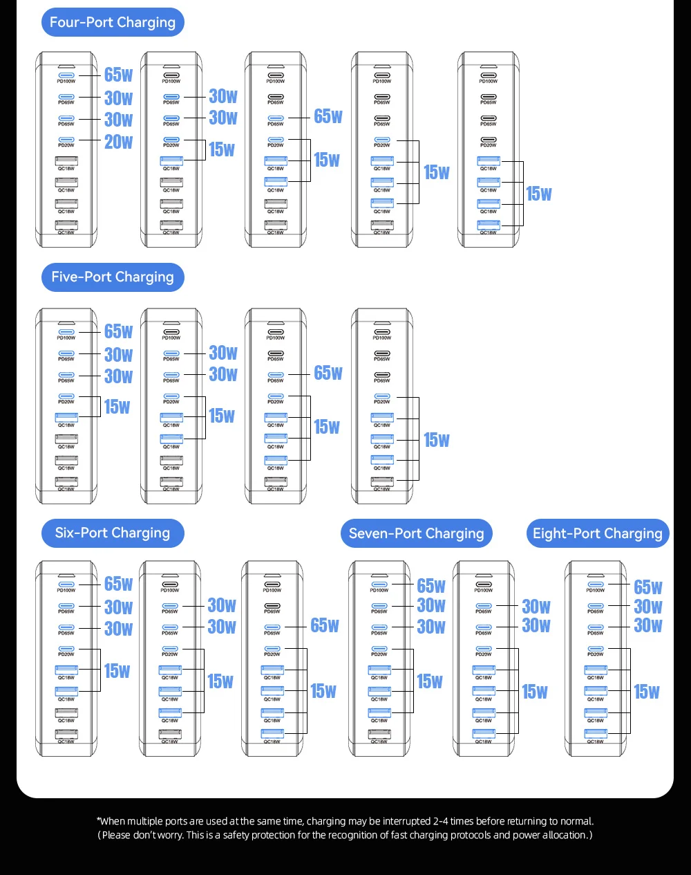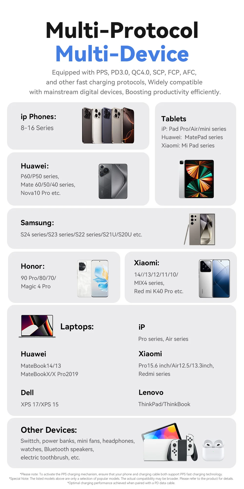 Non devi preoccuparti della sicurezza: il sistema intelligente di riconoscimento dei dispositivi distribuisce dinamicamente la potenza, in modo che ogni dispositivo riceva esattamente la potenza di cui ha bisogno. Che si tratti di un dispositivo Apple, Samsung, Xiaomi o Huawei, l'ampia compatibilità (PPS, PD3.0, QC4.0, SCP, FCP, AFC) garantisce la massima velocità di ricarica.