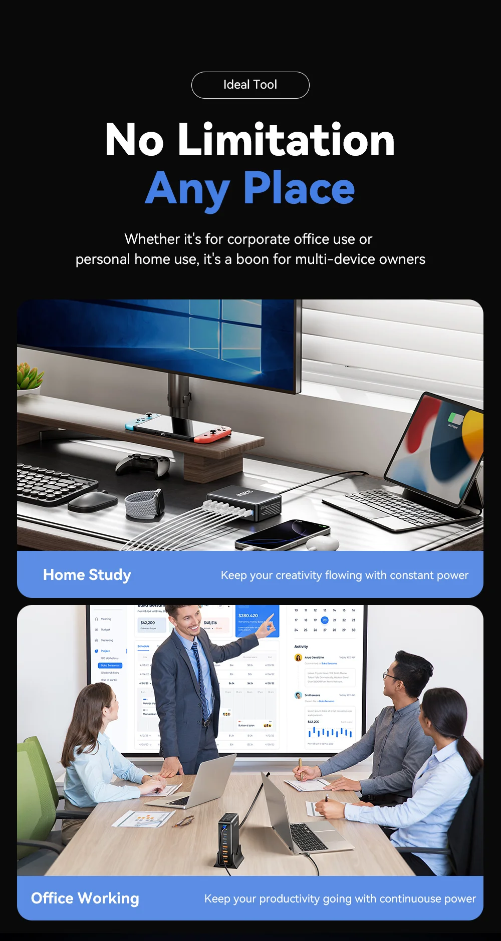 Sulla scrivania: l'elegante supporto inferiore mantiene il caricabatterie stabile, offrendo un aspetto ordinato ed esteticamente gradevole e tenendo tutti i dispositivi (laptop, telefoni, accessori, ecc.) sempre a portata di mano e carichi.